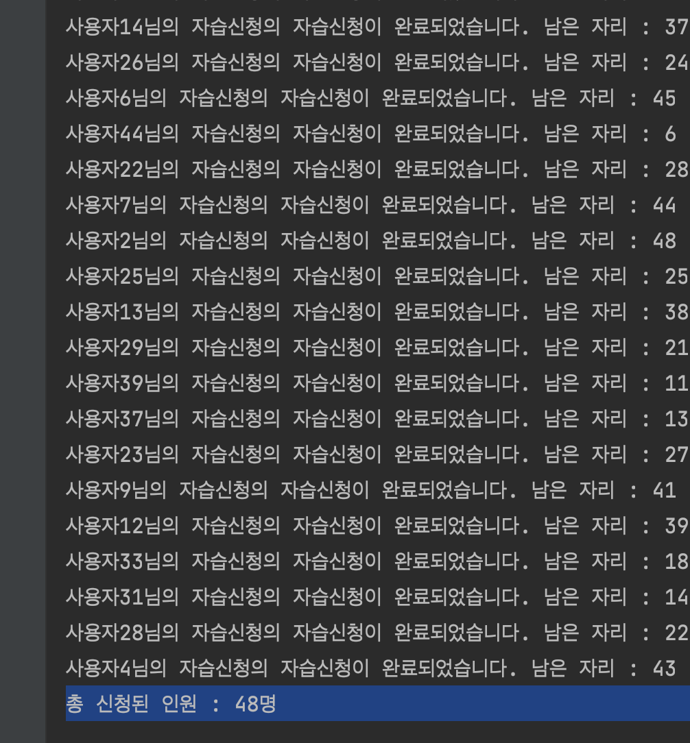 System.out.println(account.getName() +"님의 자습신청의 자습신청이 완료되었습니다. 남은 자리 : " + count);